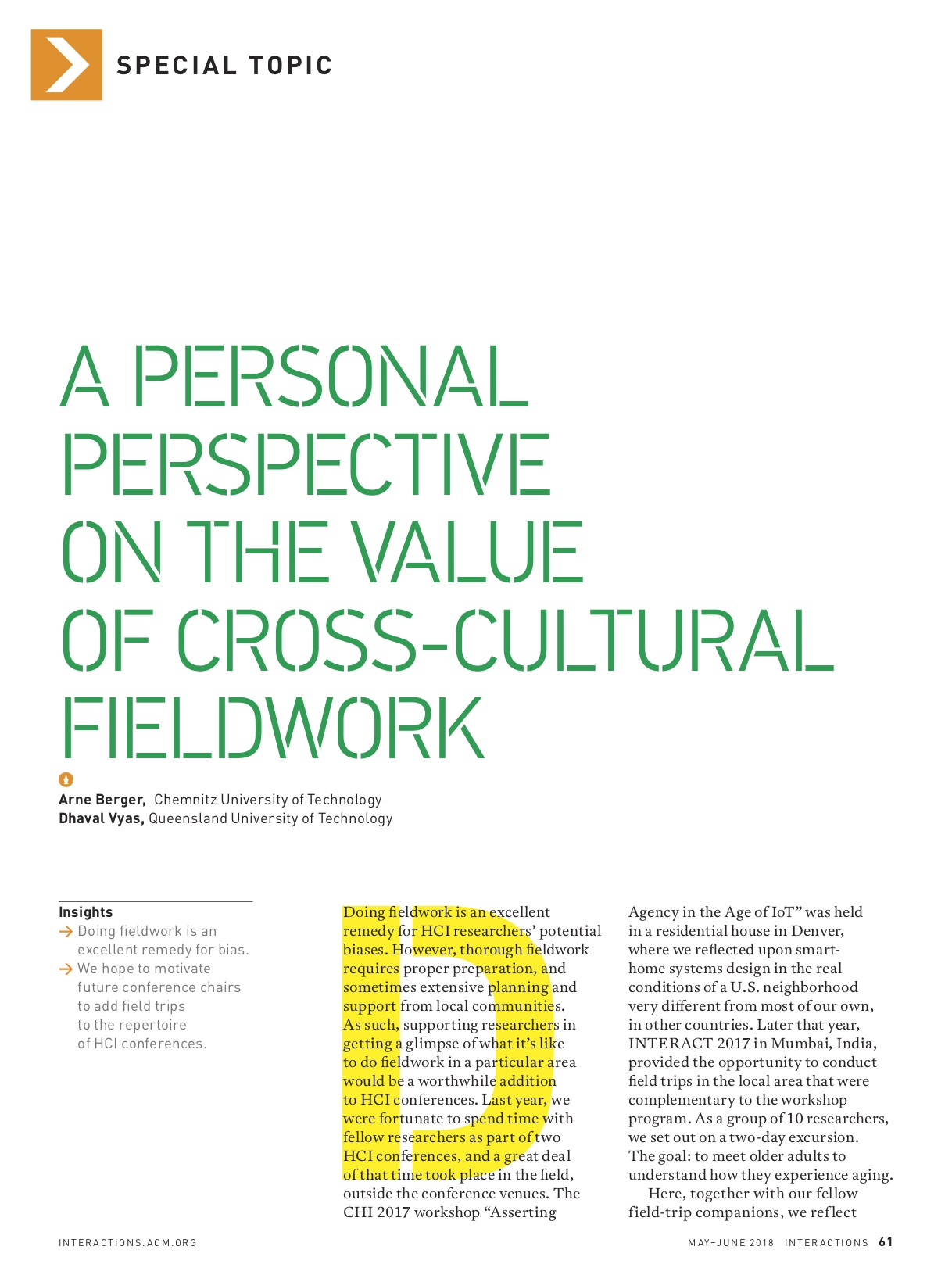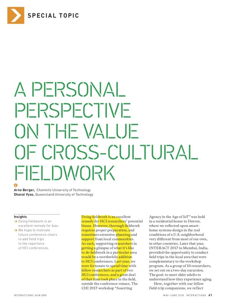 Arne Berger and Dhaval Vyas. 2018. A personal perspective on the value of cross-cultural fieldwork. interactions 25, 3 (May-June 2018), 61–65. DOI: https://doi.org/10.1145/3194335